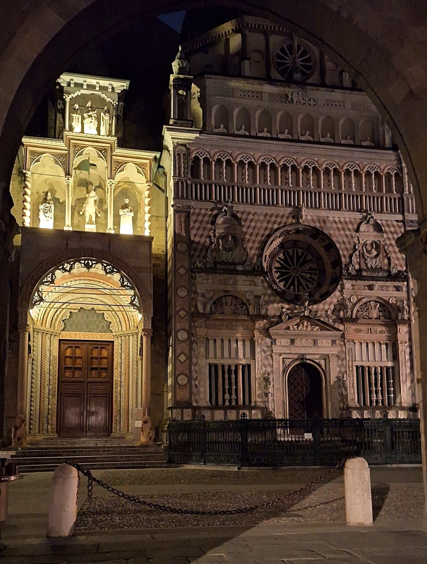 When you look to the other side through the Portici della Ragione, to the Piazza Duomo you'll see the Basilica di Santa Maria Maggiore and the Capella Colleoni.