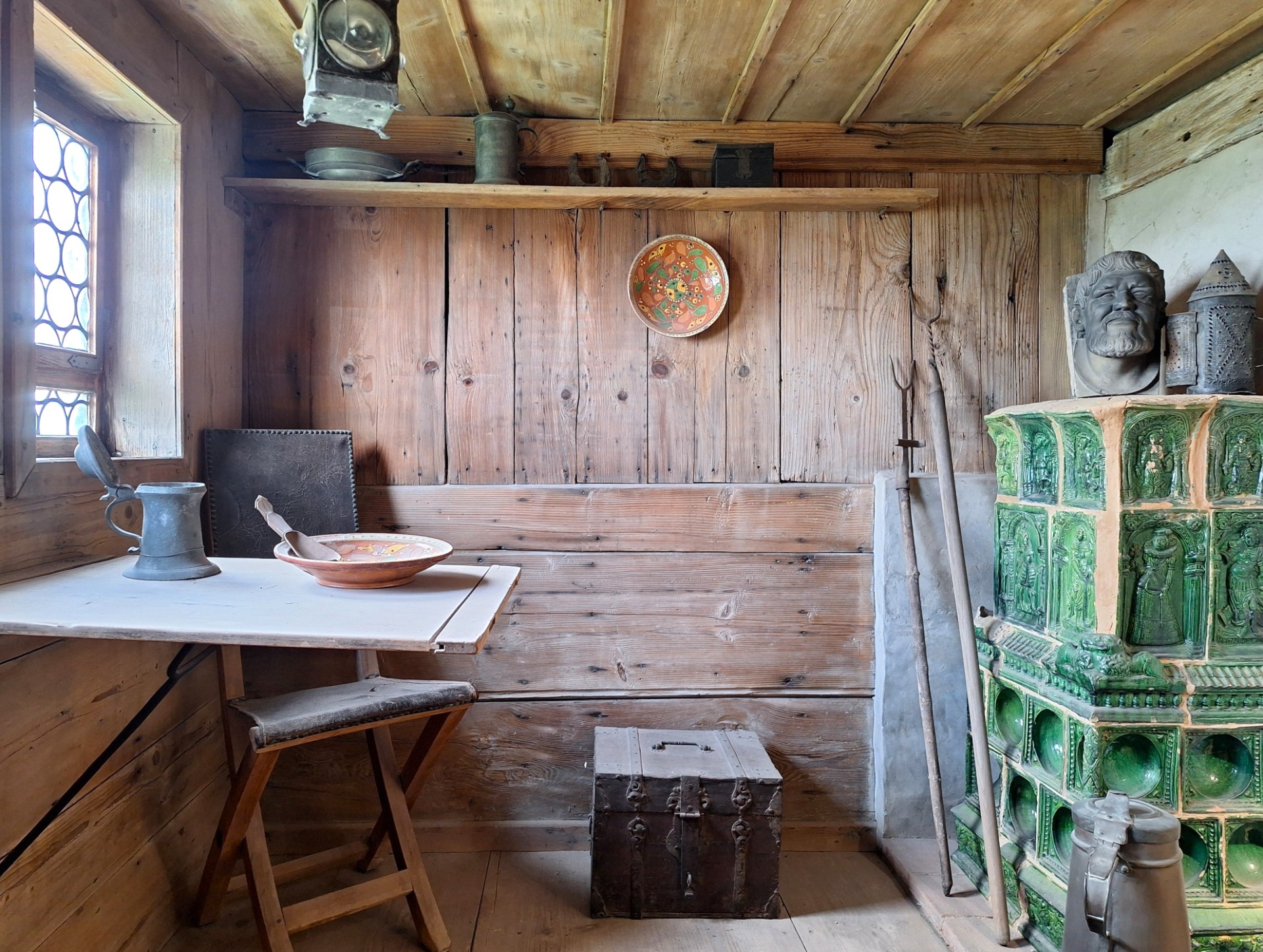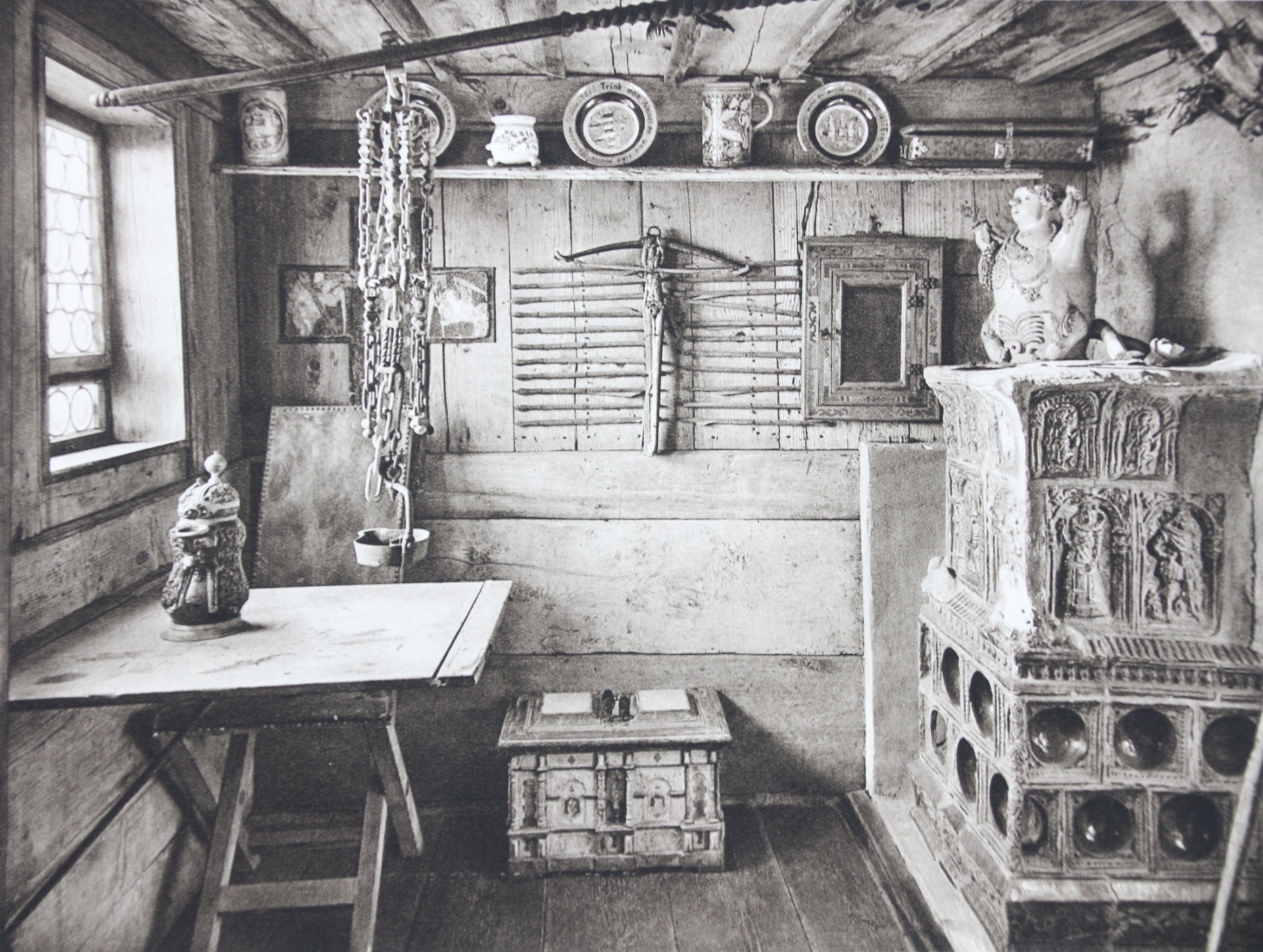 Funny to see how this rooms looks almost the same though all objects for decoration have been replaced. Also, the plate in the middle is not one on Kurt Hielscher's photo. The table, chair and stove are the same I think, the chest might be the same one too, only turned. The shelf has been renewed and maybe the planks of the ceiling too? Most knots on the wall are quite similar. Instead of looking for the ten differences, here it might be more interesting to discover the 10 similarities. Because I had to rephotograph from really close by and through bars, this was a hard one, but I'm happy with the result.