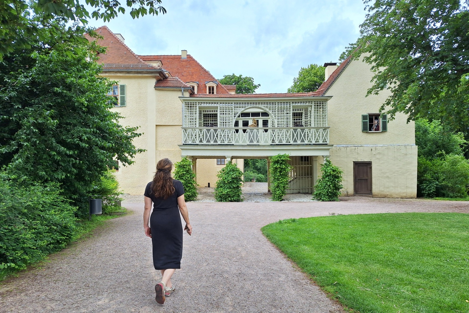 Kim approaching Schloss Tiefurt with the characteristic covered walkway in between both its parts. We checked a few closed doors on the right before we found the entrance at the rear end of the main building on the left.