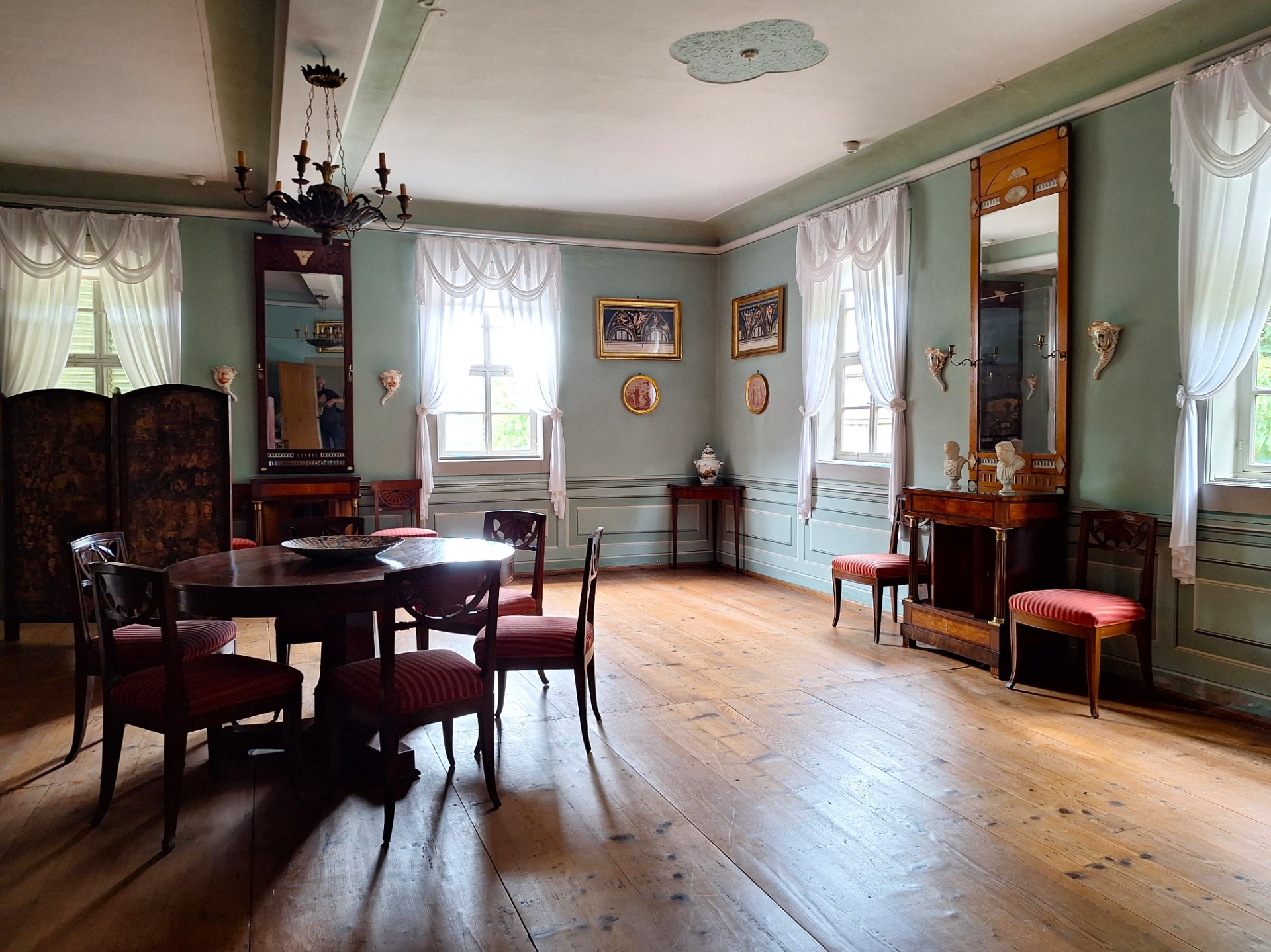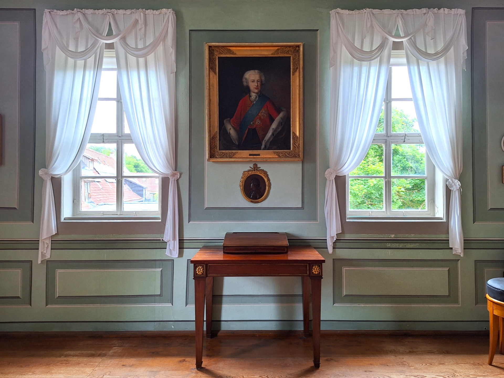 The painting of Anna Amalia's husband, Ernst August II. von Sachsen-Weimar und Eisenach who passed away too early, is now at the other side of the room. This way they can stare at each other the whole day, every day.